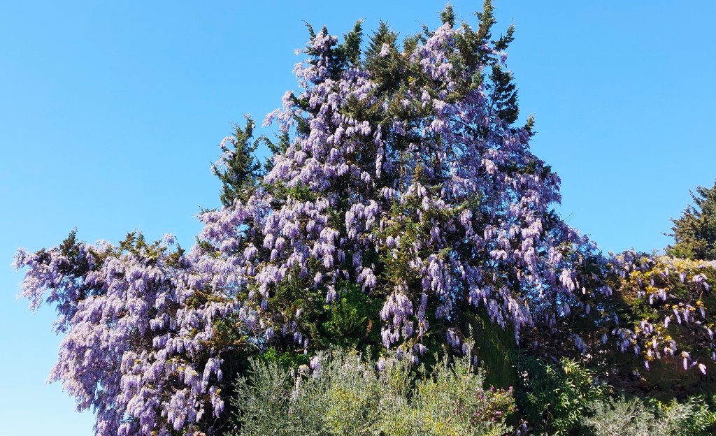 A new scent meets me on the breeze. Sweet like lilac, but musky and warm against my cheek. I look up to find Wisteria enveloping an evergreen tree. Only the furthest extremities of the native tree can be seen. Once, perhaps it chose to be cloaked by this gorgeous climbing vine. Now it must surrender.